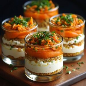 Des verrines légères et colorées à base de carottes mixées finement, relevées d’une touche de crème et d’épices douces. La texture est onctueuse et aérienne, offrant un équilibre subtil entre la douceur naturelle de la carotte et une pointe de fraîcheur. Idéales en entrée ou à l’apéritif, ces verrines apportent une note à la fois gourmande et élégante. 🥕✨
